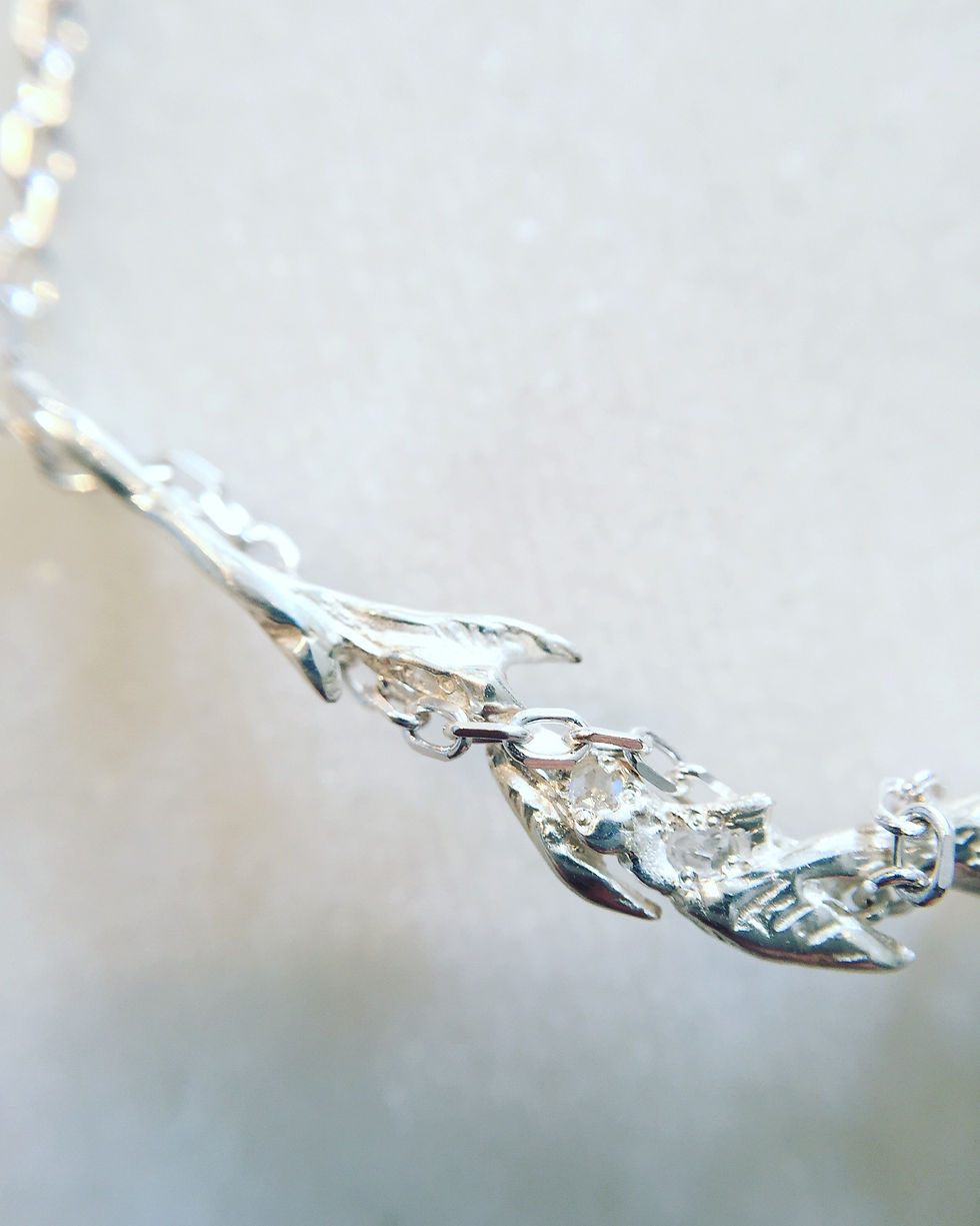 Tombée amoureuse du modèle, elle a donc souhaité décliner notre bague « Mûres Sauvages » en pendentif, et nous lui avons suggéré l’idée d’une parure intégrale incluant une mono-boucle d’oreille.